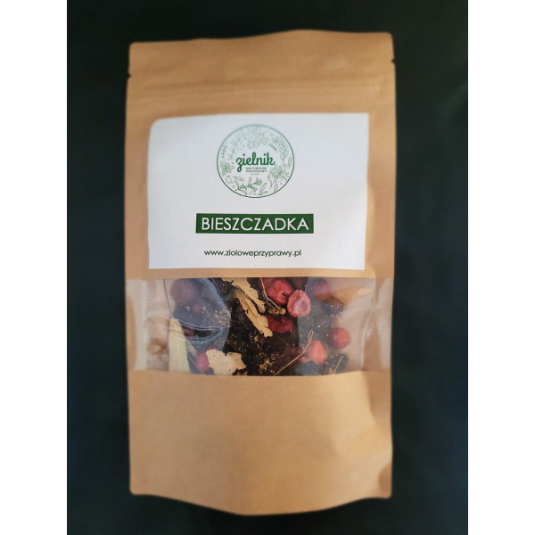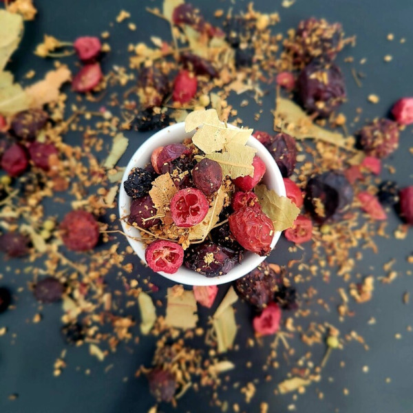 Herbata Bieszczadka to wyjątkowa kompozycja naturalnych składników: dzikiej róży, aronii, głogu, czarnego bzu i żurawiny, które wspierają odporność i mają właściwości przeciwzapalne. Jej smak łączy słodycz owoców z lekką kwasowością, dając przyjemne wrażenia podczas każdego łyku.