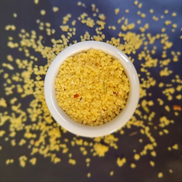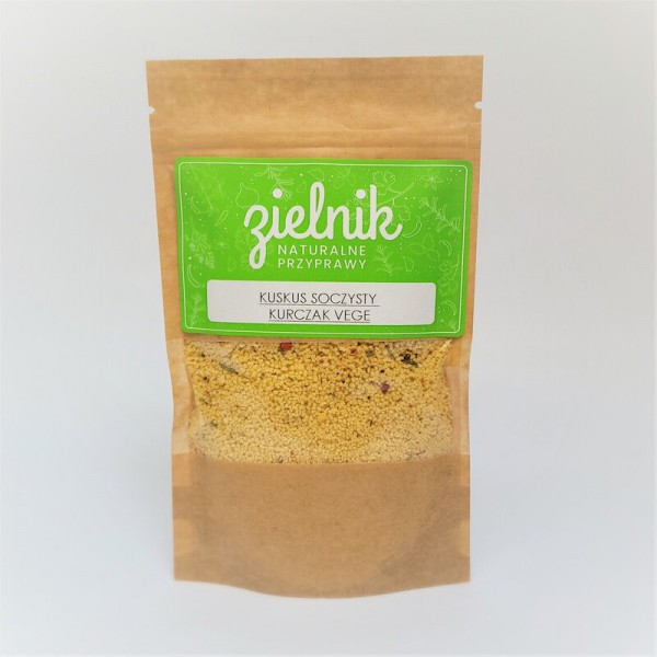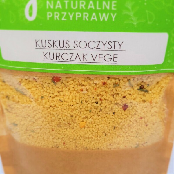 Kuskus soczysty „Kurczak” Vege to aromatyczna mieszanka drobnej kaszy kuskus z kompozycją ziół, przypraw i naturalnych dodatków, takich jak miód w proszku czy błonniki roślinne. Choć w nazwie nawiązuje do kurczaka, nie zawiera mięsa – to w pełni wegetariańska propozycja inspirowana smakiem domowego dania.