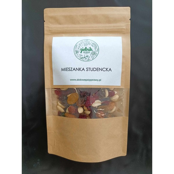 Mieszanka studencka to starannie skomponowana porcja naturalnych składników, w której znajdziesz orzechy ziemne, nerkowca, laskowe, migdały oraz suszone owoce: rodzynki golden jumbo, rodzynki ciemne i żurawinę. Taka kombinacja zapewnia nie tylko wyjątkowy smak, ale również solidną dawkę witamin, błonnika i zdrowych tłuszczów.