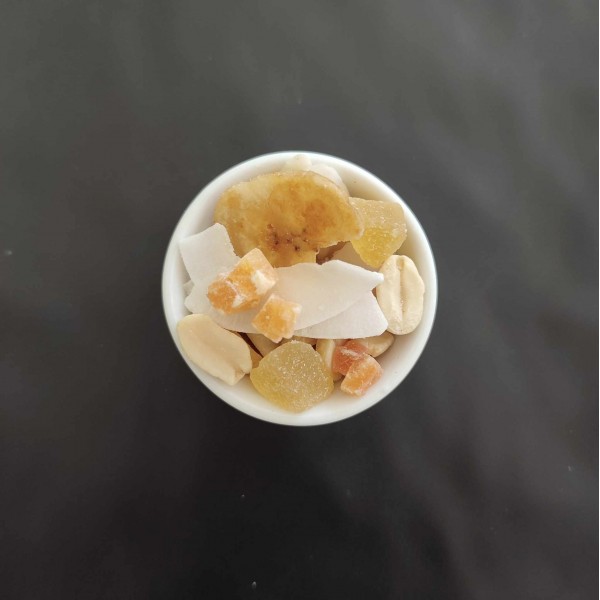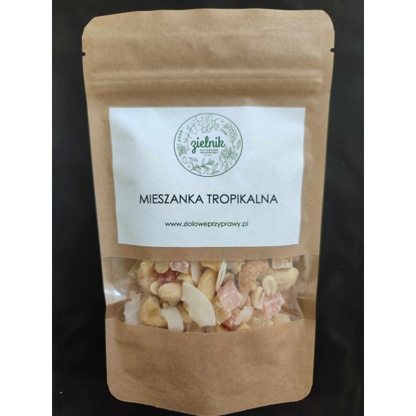 Mieszanka tropikalna to pyszne połączenie orzechów i suszonych owoców, które razem tworzą wyjątkową kompozycję smakową. W składzie znajdziesz orzechy ziemne, nerkowca, migdały oraz ananasa i papaję w wersji kandyzowanej, a także chrupiące chipsy bananowe i kokosowe.