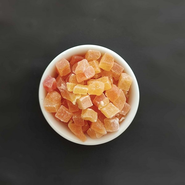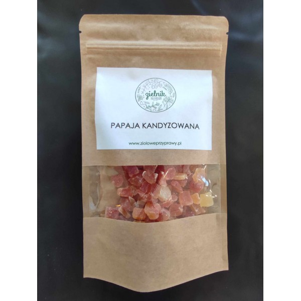 Papaja kandyzowana to słodka i aromatyczna przekąska o wyjątkowym, egzotycznym smaku. Dzięki procesowi kandyzowania owoce zachowują swoją miękkość i wyrazisty kolor, co czyni je świetnym dodatkiem do ciast, owsianek, deserów oraz jako dekorację potraw.