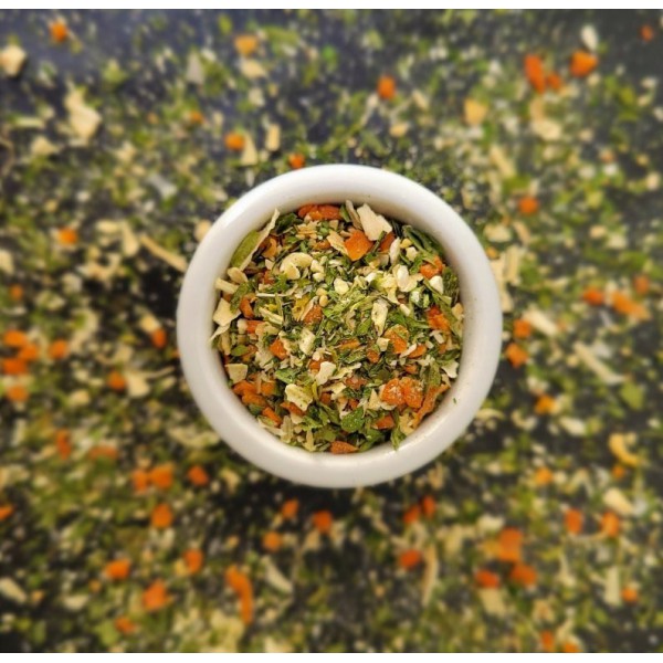 Vege Rosolnik to wyrazista kompozycja suszonych warzyw, takich jak marchew, cebula, pietruszka, czosnek, por, pasternak oraz zioła – natka pietruszki i lubczyku. Idealna do codziennego gotowania – podkreśla smak zup, bulionów, sosów i wyrobów garmażeryjnych.