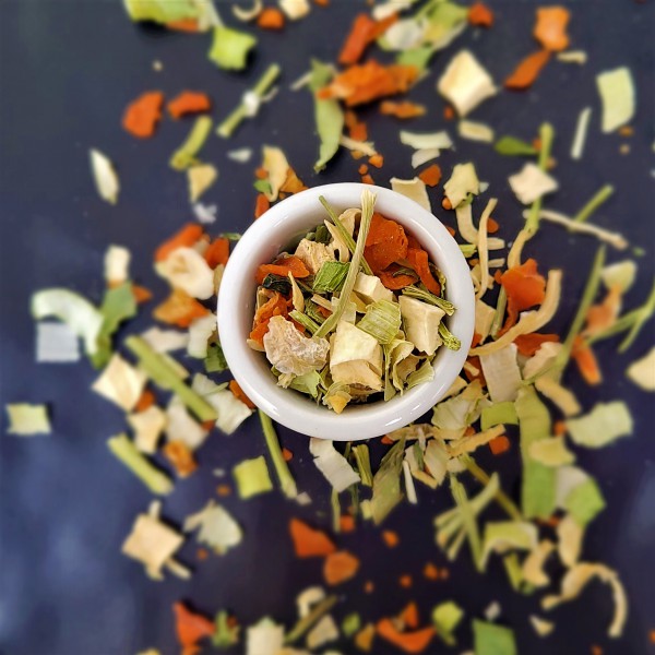 Vege susz warzywny to aromatyczna mieszanka suszonych warzyw – marchwi, pora, pasternaku, cebuli i łodygi pietruszki. Sprawdzi się jako baza do bulionów, zup, sosów i dań garmażeryjnych, zarówno w kuchni roślinnej, jak i tradycyjnej.