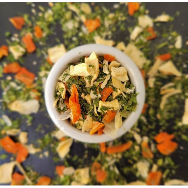 Vege Warzywko to klasyczna mieszanka suszonych warzyw, która doda smaku każdej potrawie. W składzie znajdziesz marchew, pasternak, cebulę, por, czosnek, koper i natkę pietruszki – wszystko, co potrzebne do pysznych domowych zup, sosów, bulionów i wyrobów garmażeryjnych.